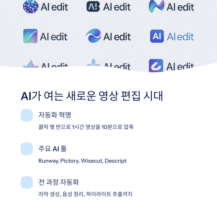 크리에이터들의 제작 시간을 획기적으로 줄여주고 있습니다.대표적인 AI 툴로는 Runway, Pictory, Wisecut, Descript 등이 있으며,
