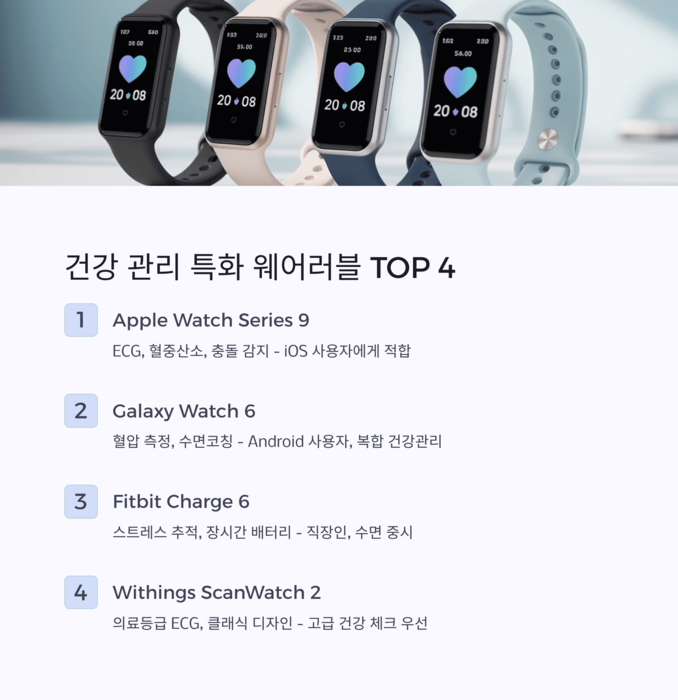 Apple Watch Series 9 ECG, 혈중산소, 충돌 감지 전 연령대, iOS 사용자 Galaxy Watch 6 혈압 측정, 수면코칭 Android 사용자, 복합 건강관리 Fitbit Charge 6 스트레스 추적, 장시간 배터리 직장인, 수면 중시 사용자 Withings ScanWatch 2 의료등급 ECG, 클래식 시계형 고급 건강 체크 우선 사용자 각 제품은 자체 건강 앱과 함께 사용 시 라이프스타일 개선 효과도 높습니다.