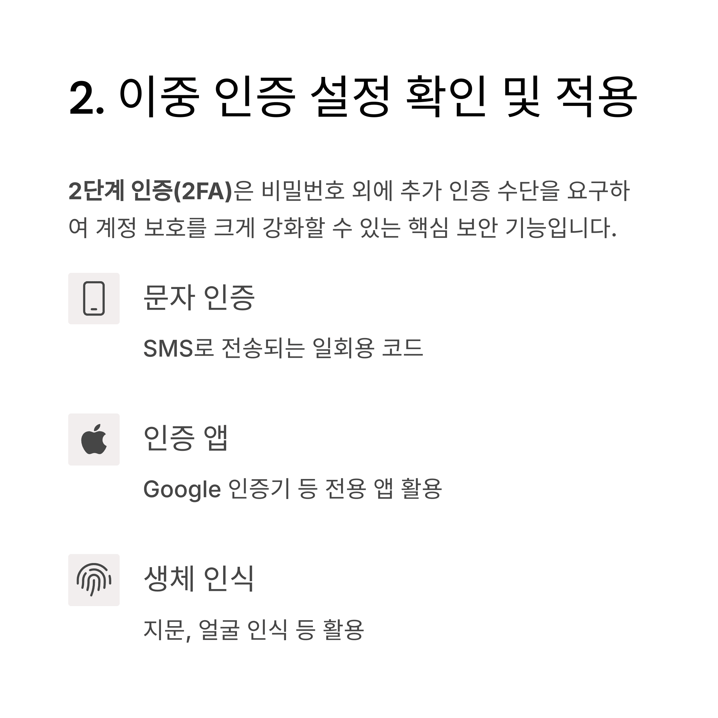 계정 보호를 크게 강화할 수 있는 핵심 보안 기능입니다.로그인 시 문자 인증, 인증 앱, 생체 인식 등을 함께 설정해 두었다면